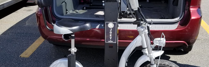 It seems that Bruno has changed how the Bruno Joey works compared to the one we saw in the parking lot of the Boston Abilities Expo. The lift just comes straight out and straight down, and the platform is slightly smaller. We met the Mobility Works folks at the Expo and talked to their NH office. Aaron Morse was assigned to work with us and our unorthodox mobility scooter. He thought it could work, even with the new design.